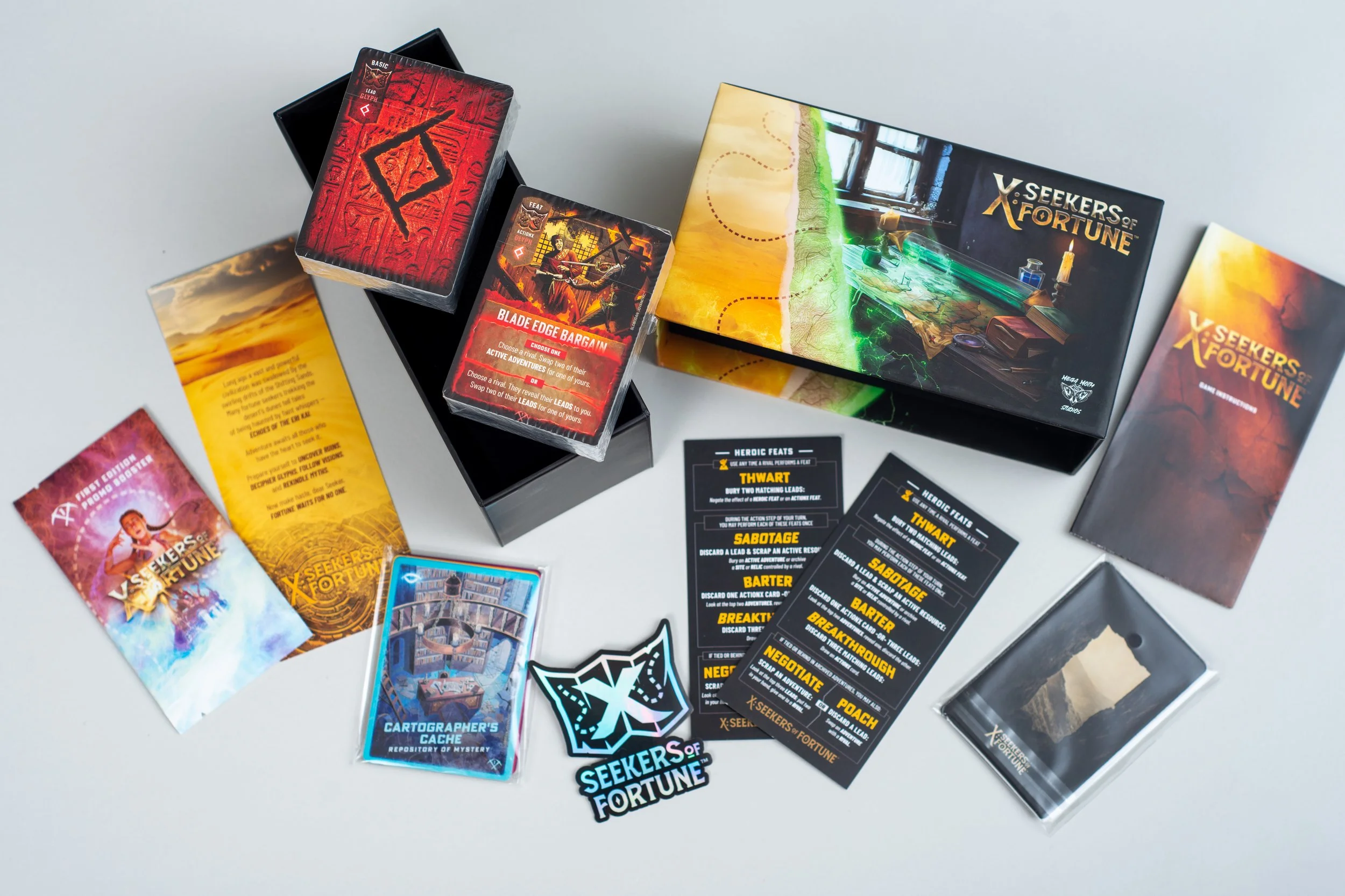 FIRST EDITION EXCLUSIVE - Promo Pack including four ActionX cards not included in the base game, an alt-art Make Off With and four Wild leads will not be included in the future editions of the X: Seekers of Fortune™ deluxe or base game.